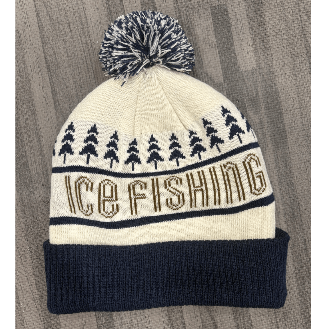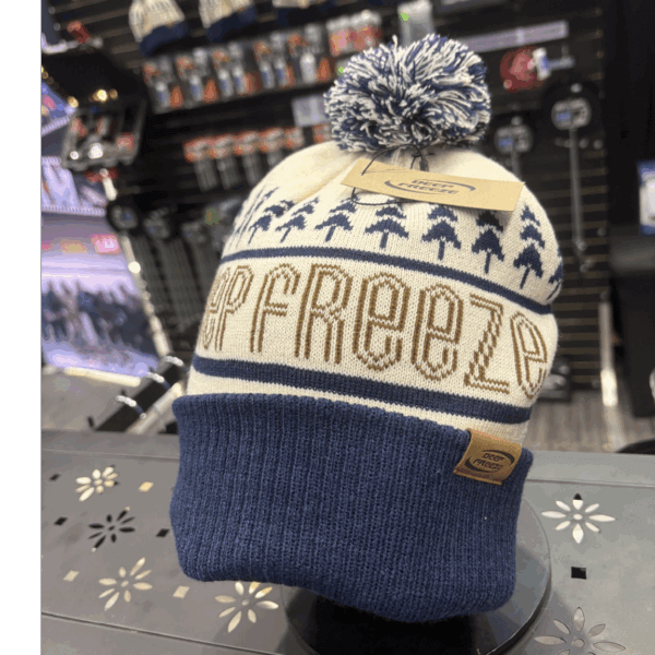 Represent with the retro knit in stocking cap! Ribbed cuff and Deep Freeze suede label. Colors are Brown/Navy Blue.